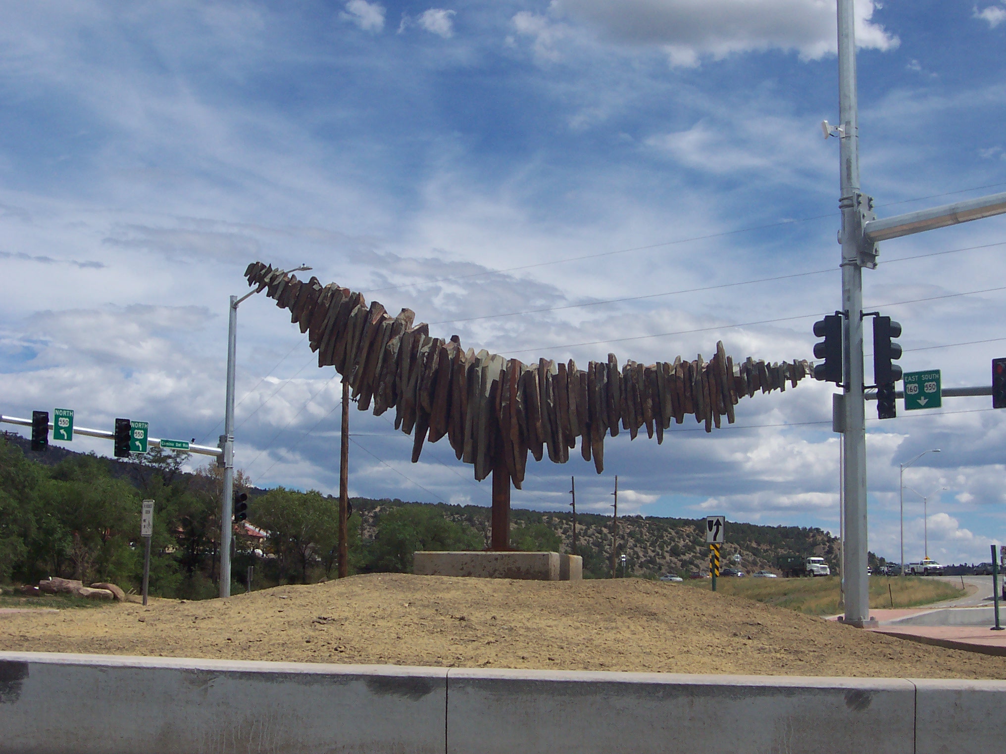 The City of Durango, in one of their beautification planning sessions, decided this intersection needed to be more than just a bunch of concrete and asphalt. (It was obviously keeping people up at night, the idea that we had such an unartistic highway intersection in town. Something Had To Be Done. We are a town of awesome, and this drab crappiness of a traffic flow-through was not cutting the mustard.)